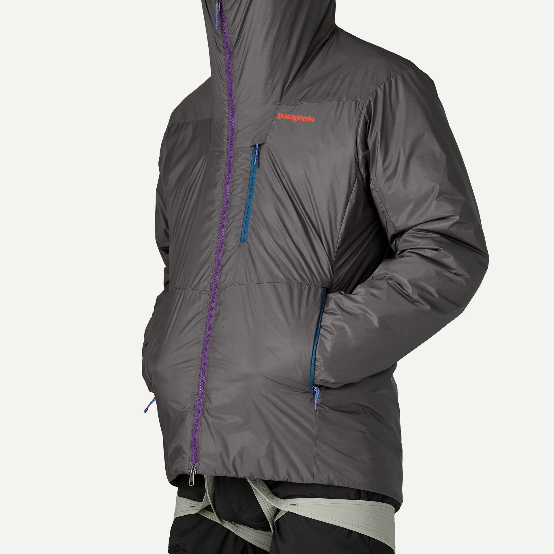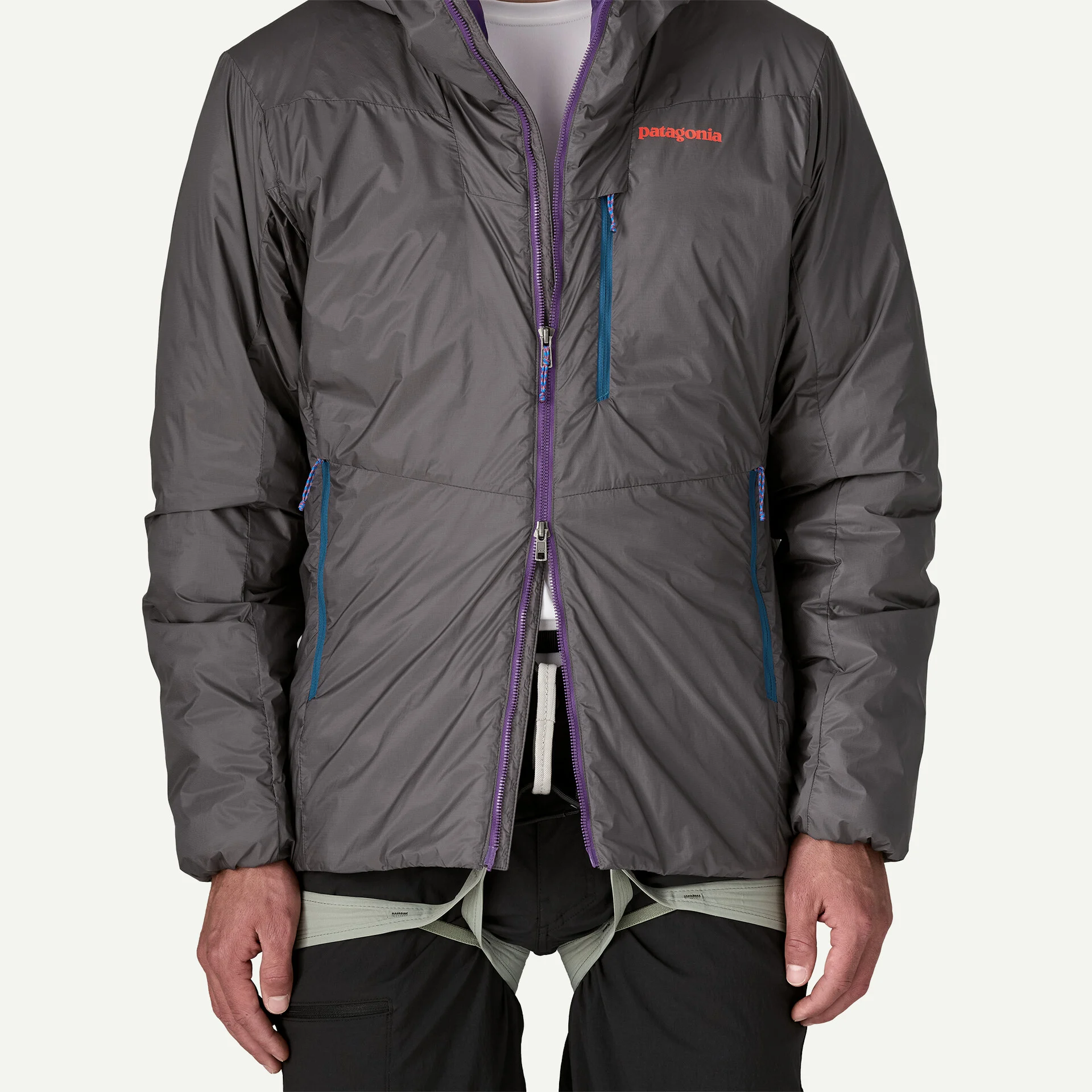 Two-way, center-front Vislon® zipper backed with an internal wind flap allows for belay loop access
