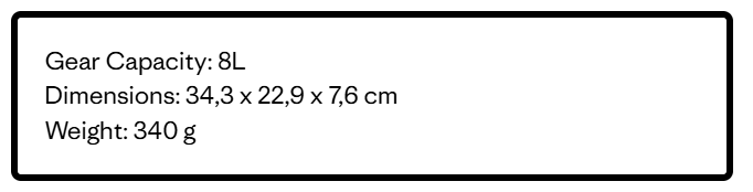 Всички тъкани са 100% рециклирани (разтегливата мрежа е 84% рециклирана),корпусът има DWR покритие без PFC (трайно водоотблъскващо покритие, което не съдържа перфлуорирана химия); обема на раницата е 8 литра
